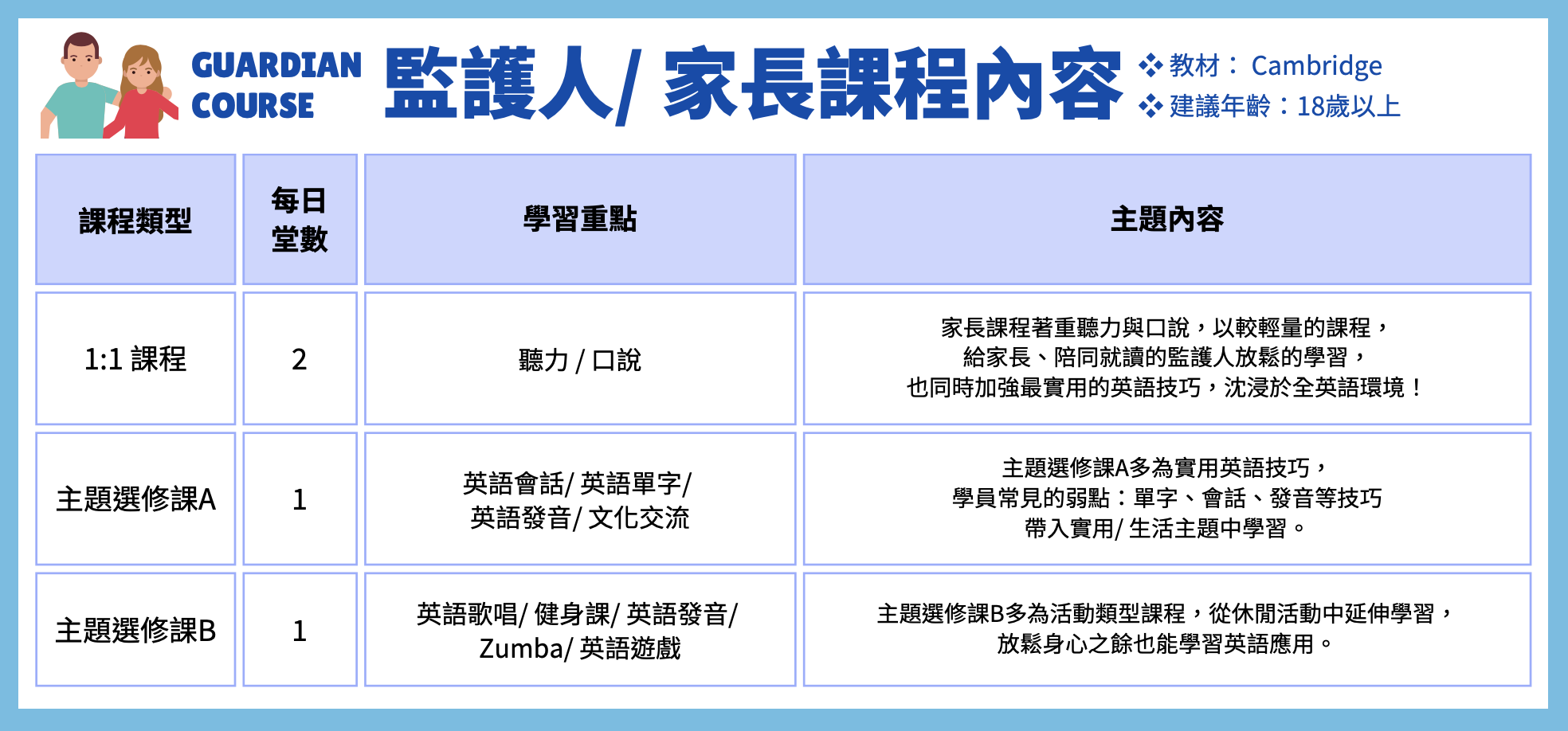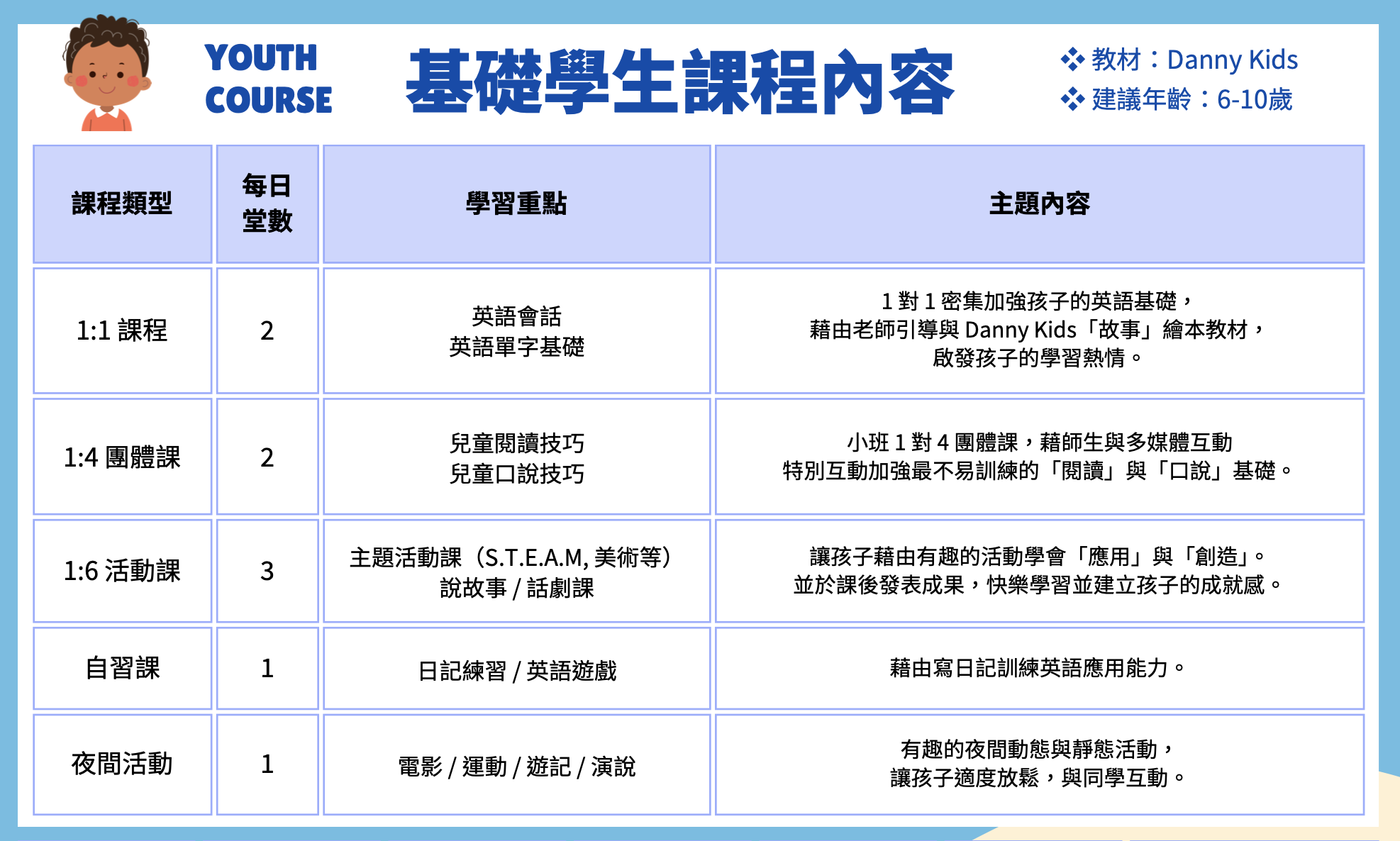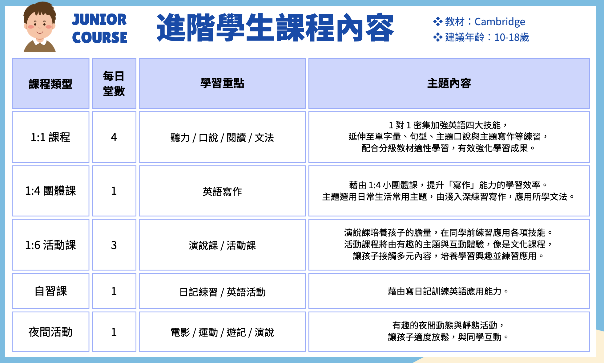 11-18歲青少年課程則採用劍橋與 GoGoBanjo 授權教材,每日10堂課密集訓練四大英語能力。