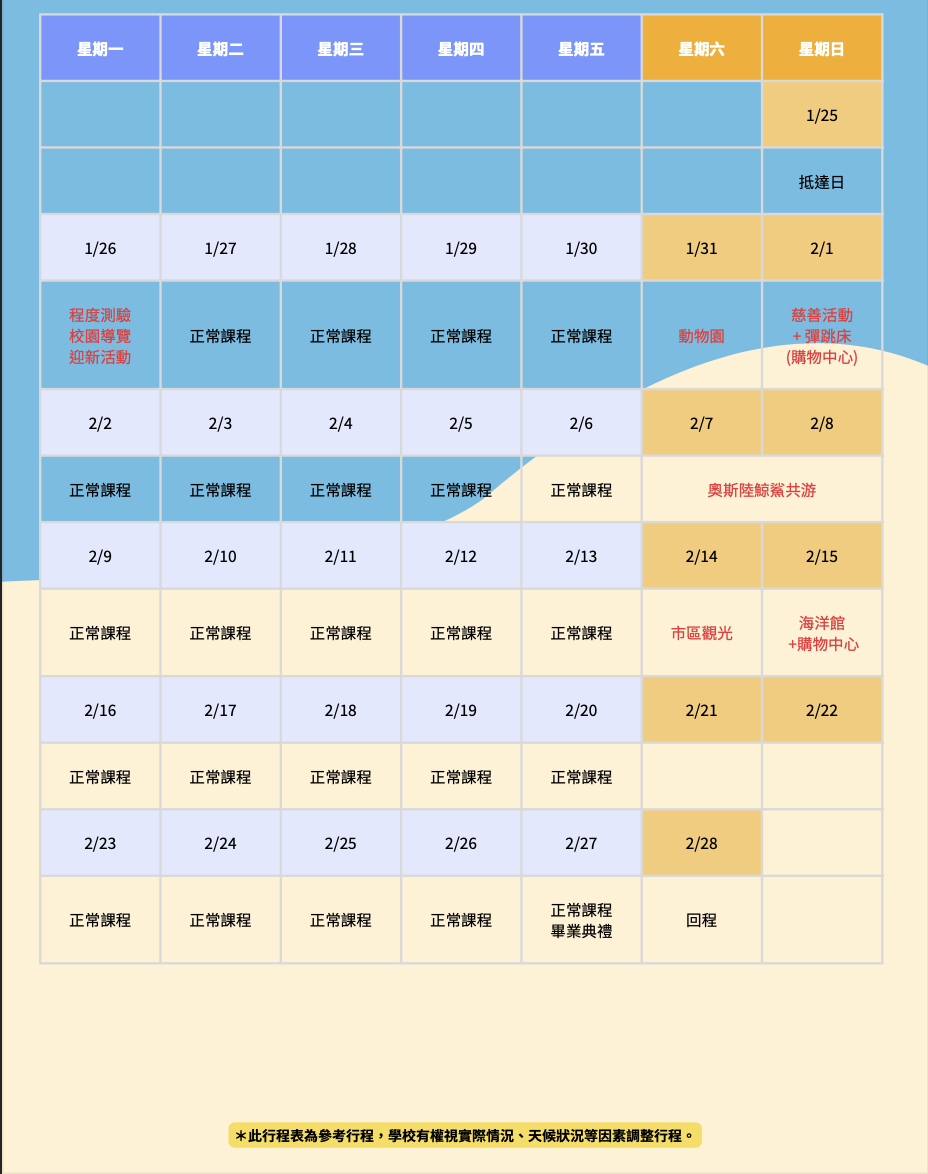 費用包含:課程、食宿、註冊費、接送機費、旅遊與活動、交通、學雜費(書籍、水電、SSP、學生ID)。