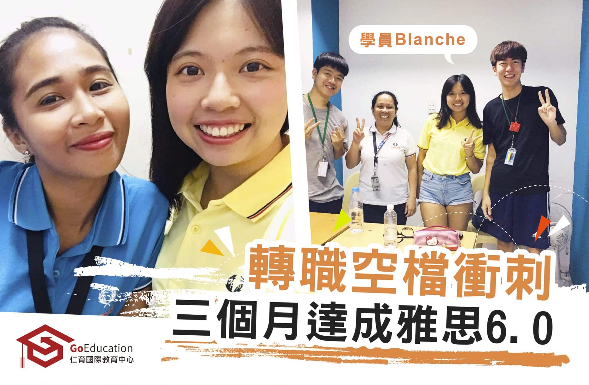 Blanch 原本在銀行業上班,趁著轉職空檔前往菲律賓遊學,只花三個月就達成雅思6.0,甚至閱讀7分的成績,Go編覺得必須分享給大家,帶著目標出發,菲律賓遊學就是可以讓你看得見成效!