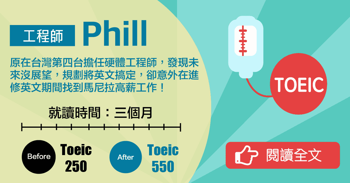 菲律賓雅思保證班幫助人原本對台灣工作不太滿意的Phill,成功達標美國研究所的入學門檻,更取得了海外工程師的offer,年薪突破百萬。