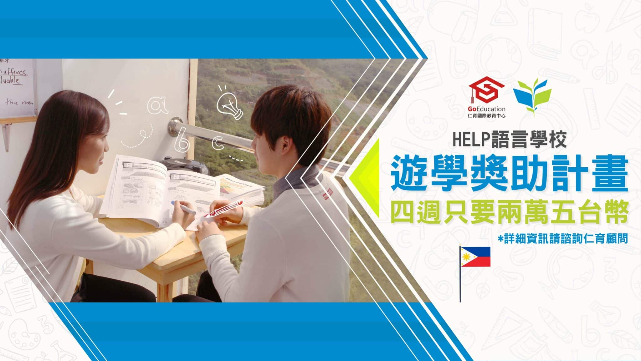 計畫九月~十二月到碧瑤、克拉克來一趟菲律賓遊學的同學們有福了! 在碧瑤、克拉克地區皆有校區的 HELP 語言學校,推出了遊學獎助金方案, 遊學四週期間,每週寫一篇遊記(遊學期間至少四篇),並上傳的網路平台上, 就享有學費以及住宿費優惠折扣,折扣之後,四週遊學費用只要兩萬五台幣!