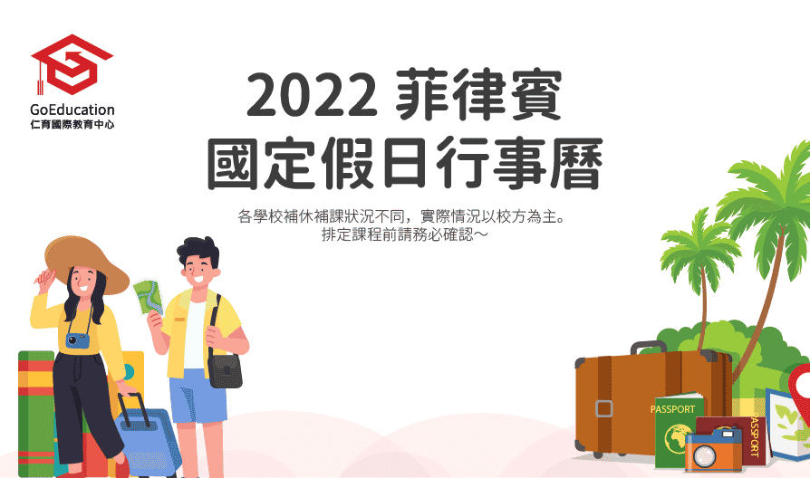 2022 菲律賓遊學行事曆出爐!菲律賓距離臺灣只有2~3小時的飛行時間,又使用英文作為官方語言,近年已成為臺灣人選擇語言學校的最佳選擇。對於想趁機出去旅遊體驗當地節慶的人而言,是非常難得的機會!然而,對於有時間壓力的學員來說,就必須事前避開假期,以免影響自己學習進度。因此,在前往菲律賓就讀語言學校前,別忘了注意以下的日期。