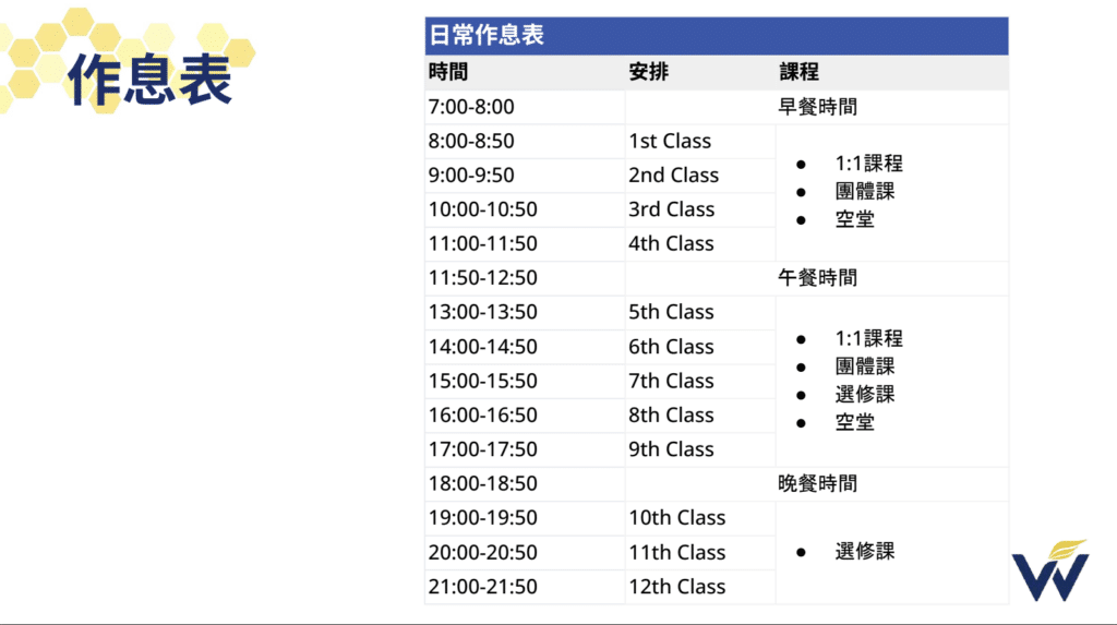 根據每個人的學習需求不同,可選擇不同堂數的學習方案,若學員已成年在課餘時間皆可到校外用餐、旅遊體驗當地文化!Winning語言學校亦有其他課程如:商務英文、旅遊英文、多益課程、雅思課程、親子遊學。